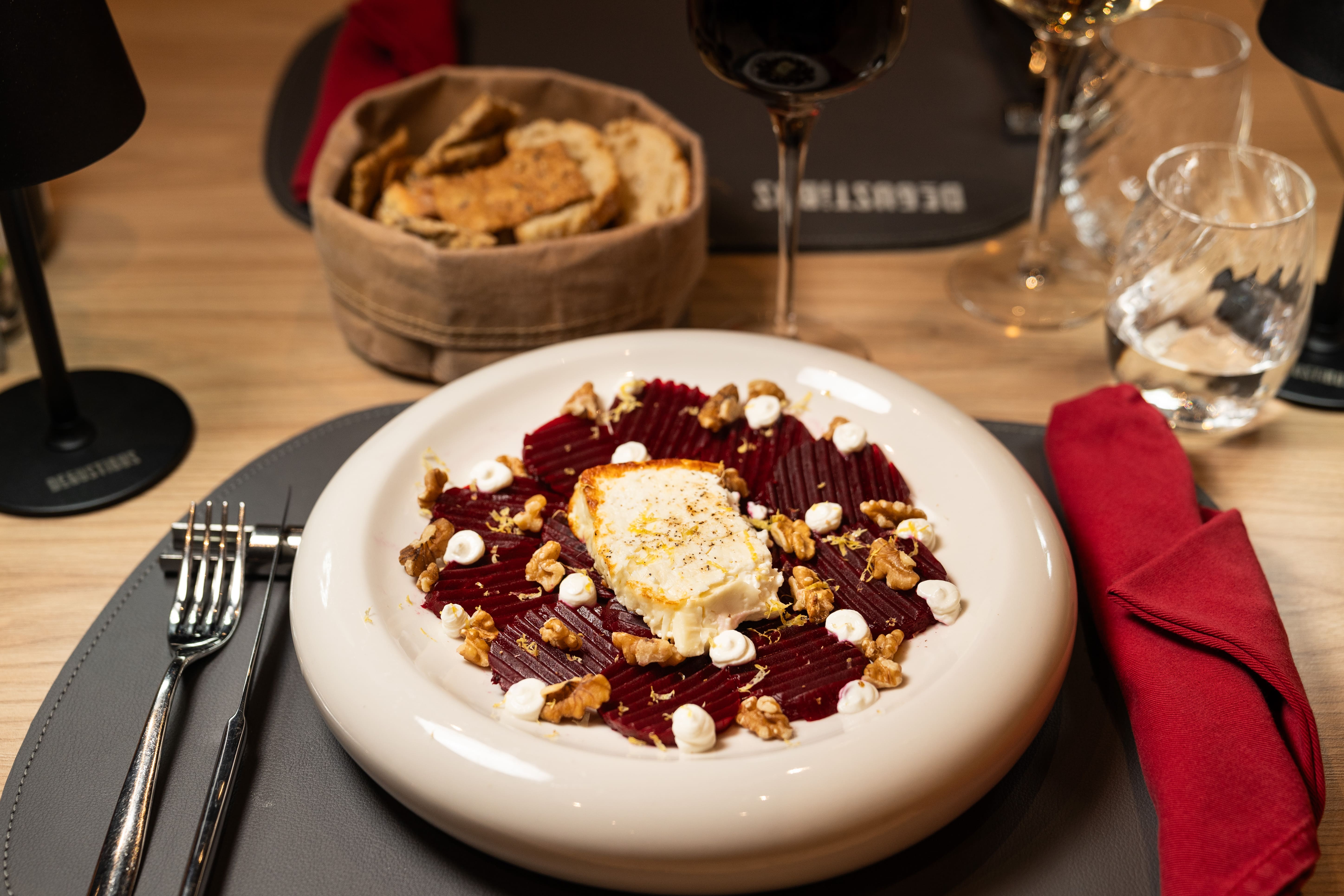 Carpaccio di barbabietole, feta arrostita, noci tostate, yogurt greco e scorza di limone