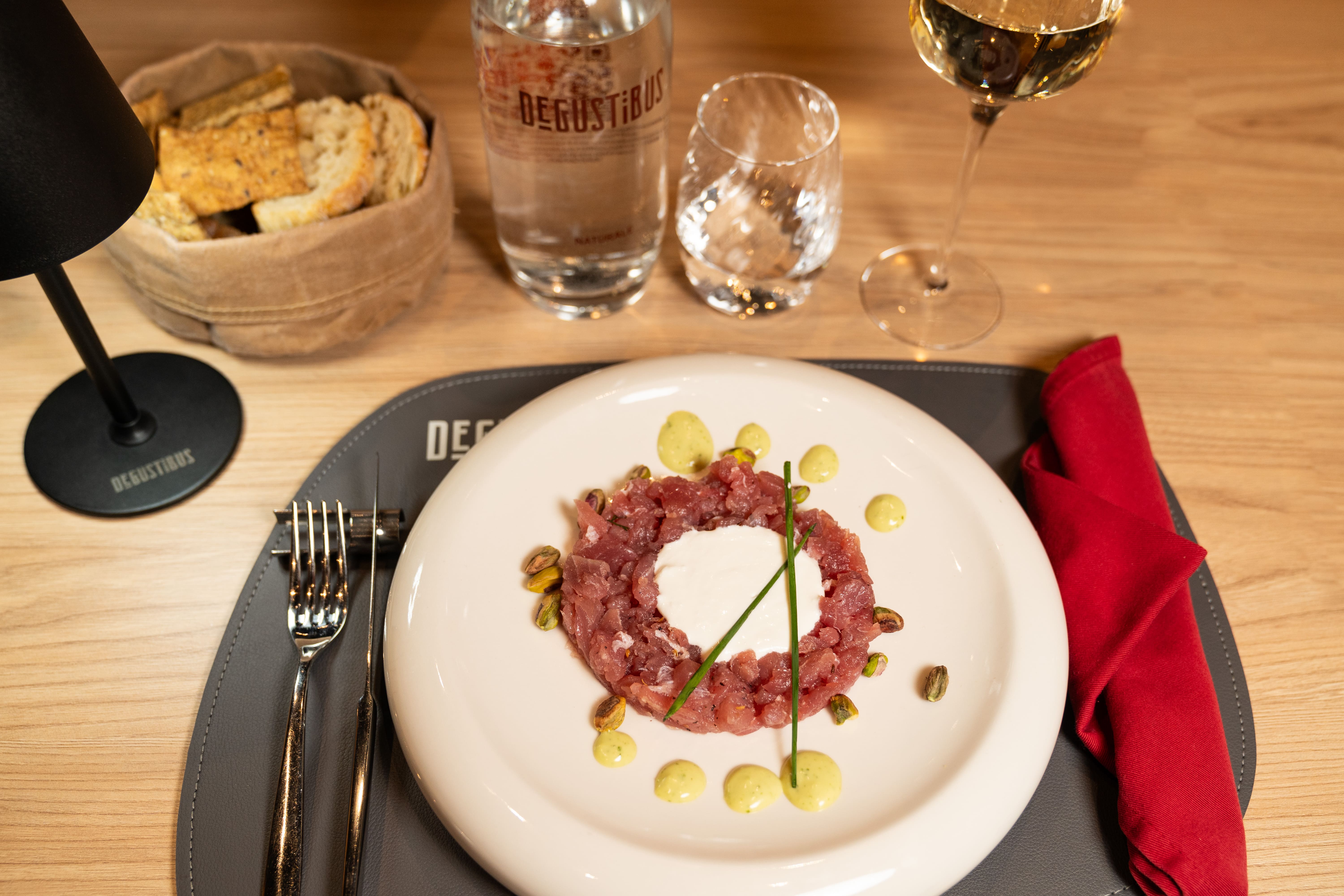 Tartare di tonno al pepe di sichuan, pistacchio tostato e burrata, servito con vinaigrette agli agrumi