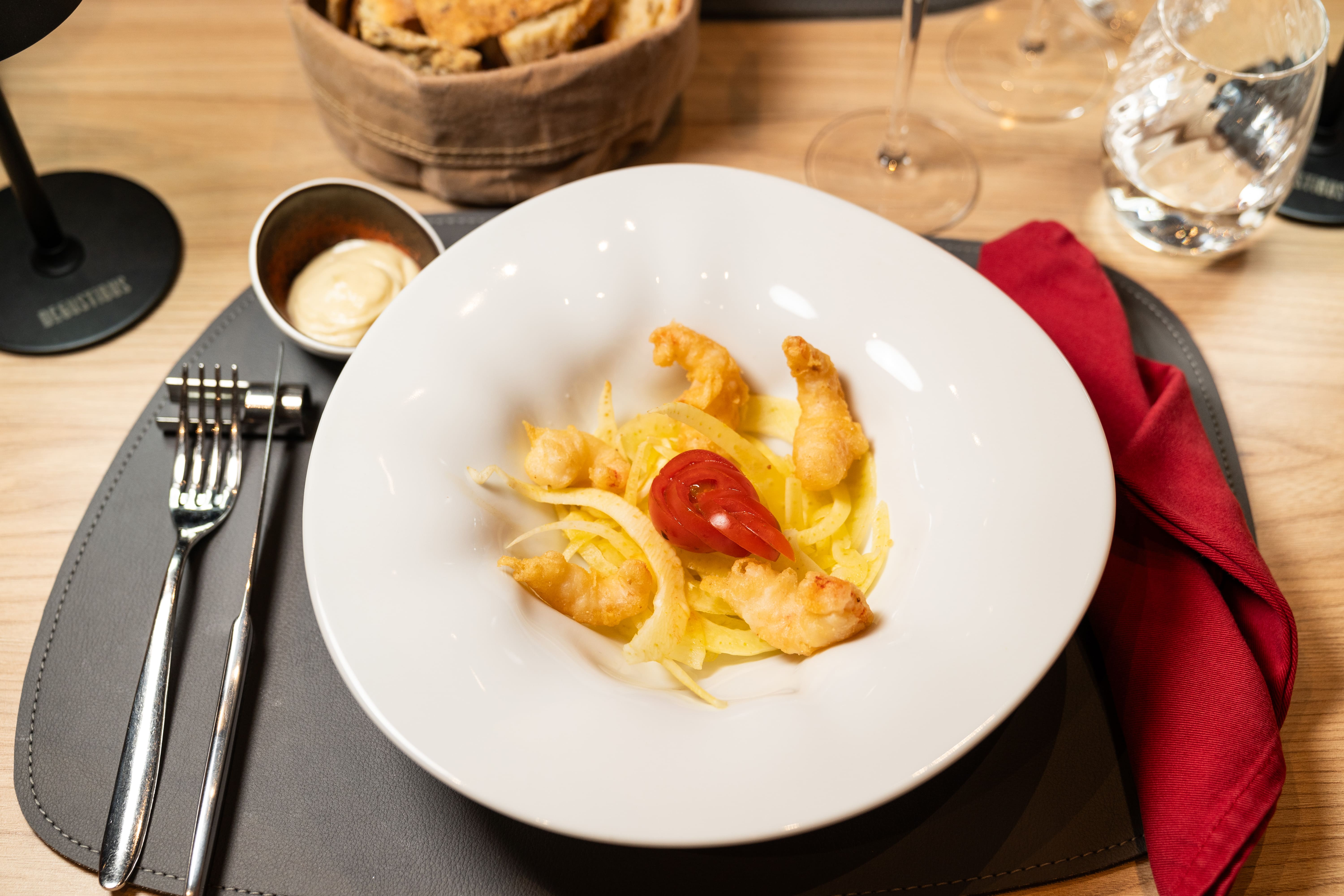 Gamberoni in tempura, maionese alla senape, carpaccio di finocchi allo zafferano.