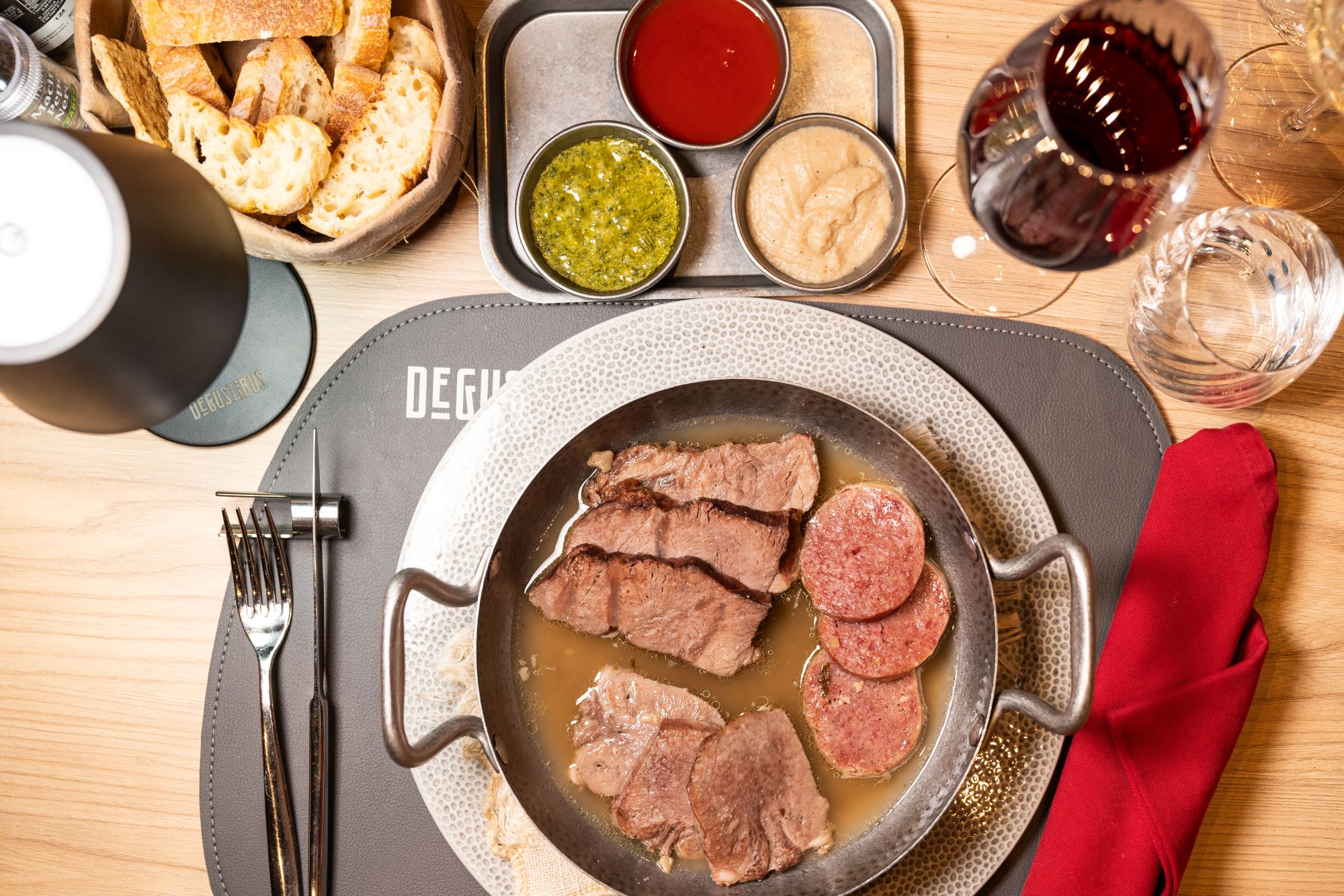 Cotechino, cappello del prete, lingua serviti in brodo caldo con salsa verde, rossa e pearà