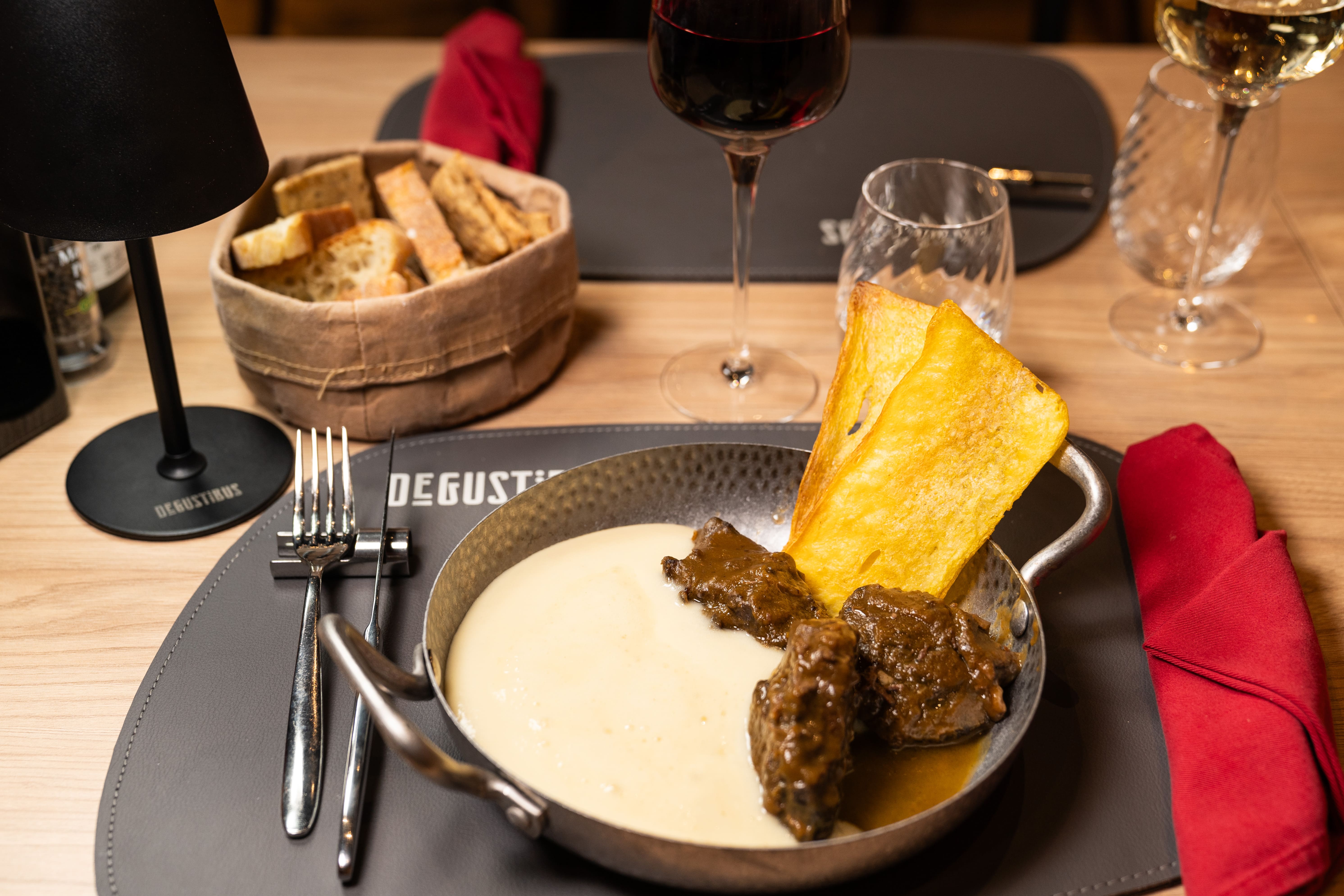 Guancia di manzo brasata, crema di patate e cialda di polenta fritta.