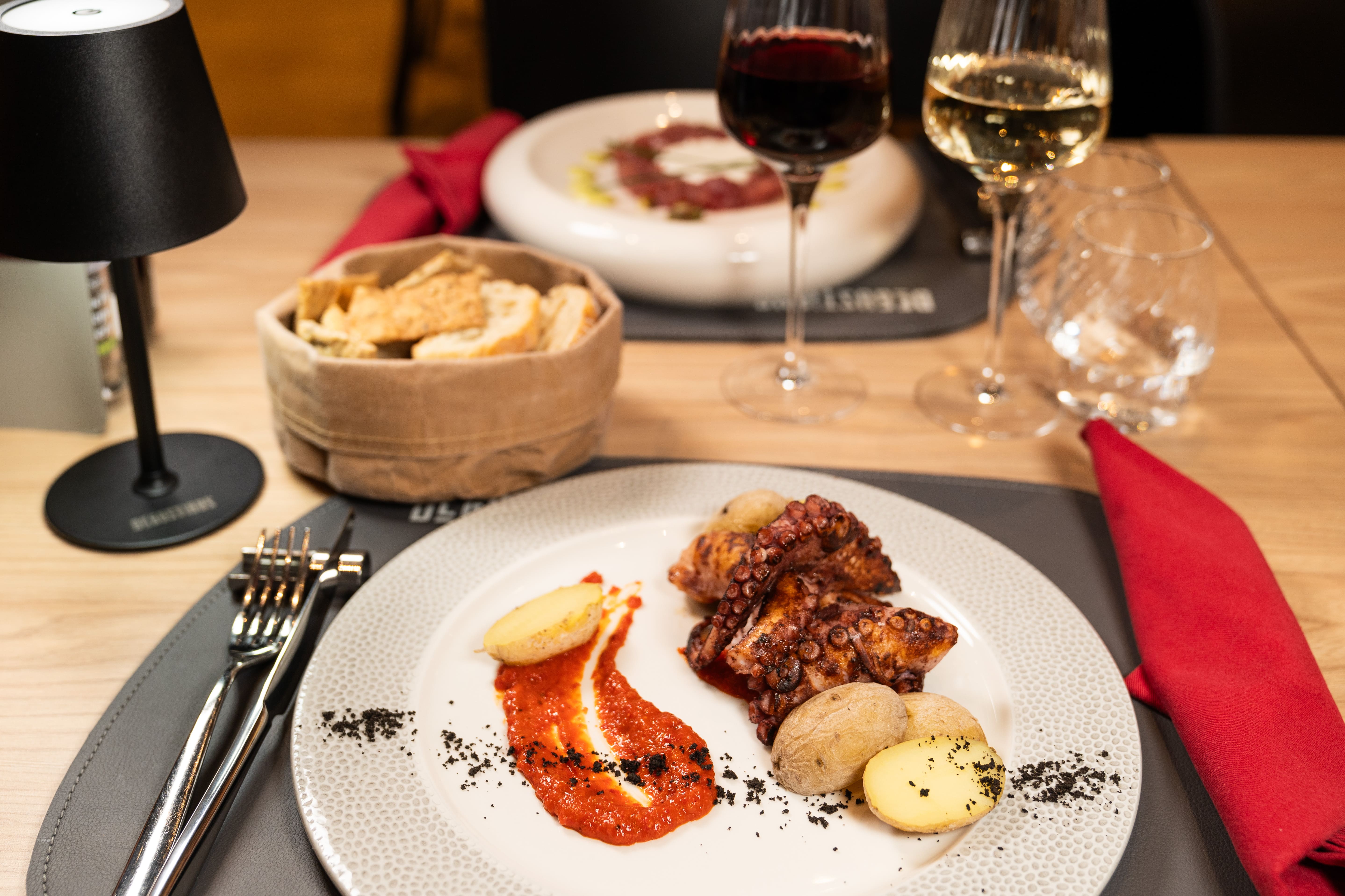 Tentacoli di polpo croccanti, crema di peperoni, papas arrugadas e polvere di olive taggiasche e olio profumato al basilico.
